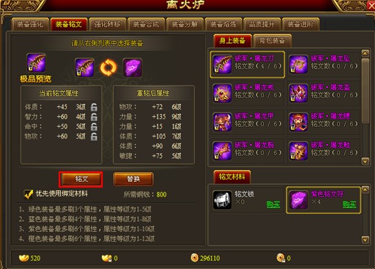 3、紫色装备最多可有6个铭文属性,属性等级为1-10级;